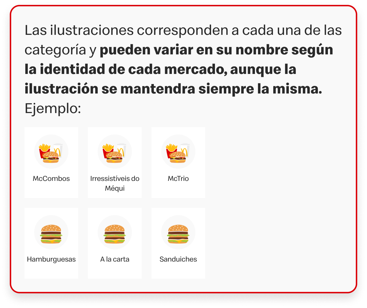 Las ilustraciones son de carácter ilustrativo y no representan de forma literal el nombre del producto. El nombre que acompañe a la ilustración puede variar según el país (como 'hamburguesa' o 'sándwich'), la ilustración seguirá siendo la misma, ya que busca transmitir un concepto general que es entendido de manera similar en todos los mercados.