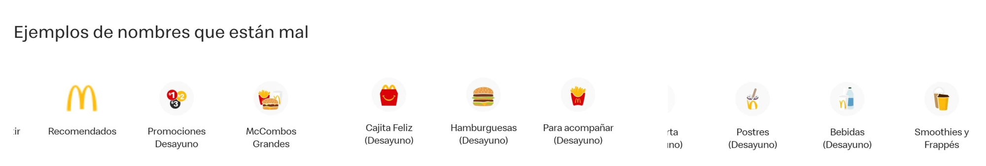 Durante el horario de daypart, las categorías que incluyan productos específicos para esa franja aparecerán en primer lugar. Aquellas categorías que se presenten en daypart y sin daypart, mantendrán su nombre original, como por ejemplo: 'Cajita Feliz Desayuno' (en daypart) y 'Cajita Feliz' (sin daypart), siempre deberá serCajita Feliz.