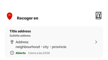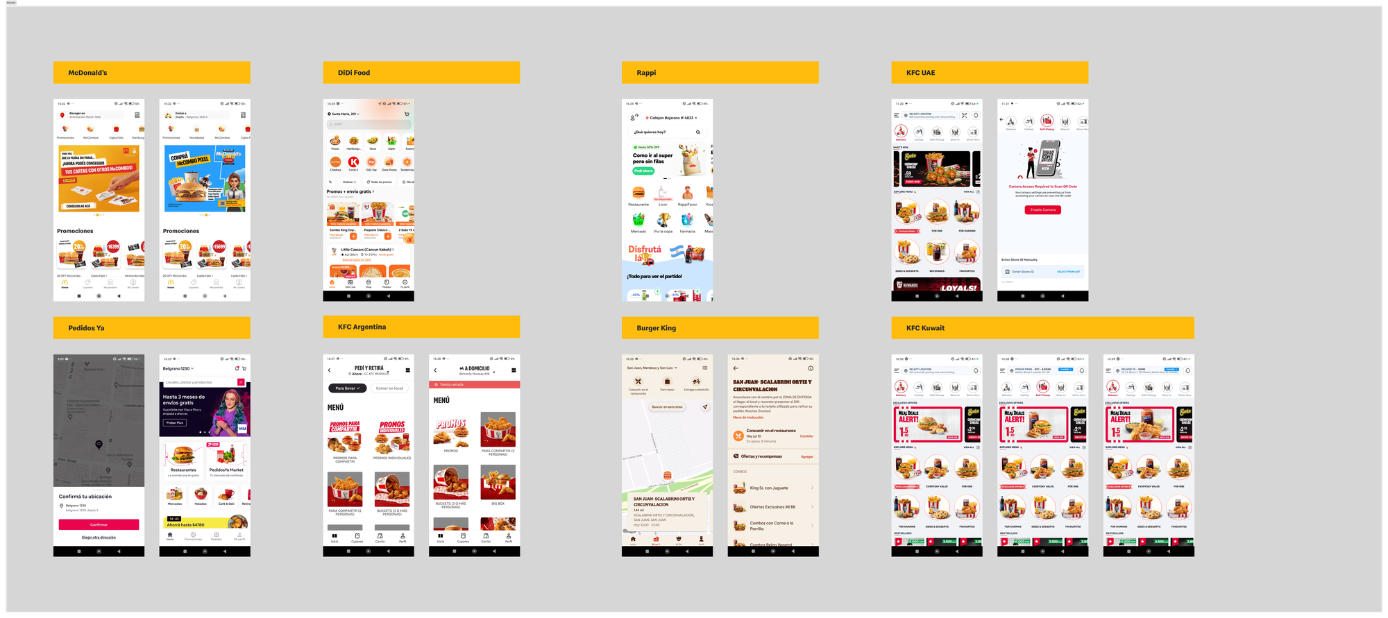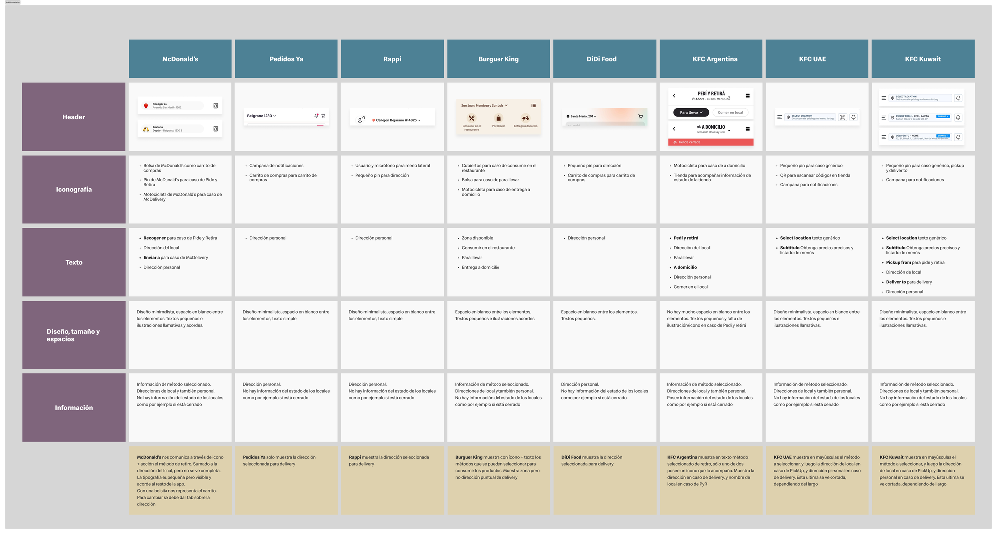- Benchmarking de buenas prácticas: Investigamos cómo otras aplicaciones de competencia directa y indirecta presentan la información de localización en sus interfaces. Esto nos ayudó a identificar patrones, elementos visuales comunes y formas efectivas de jerarquizar datos como nombre del restaurante, dirección y tipo de pedido..