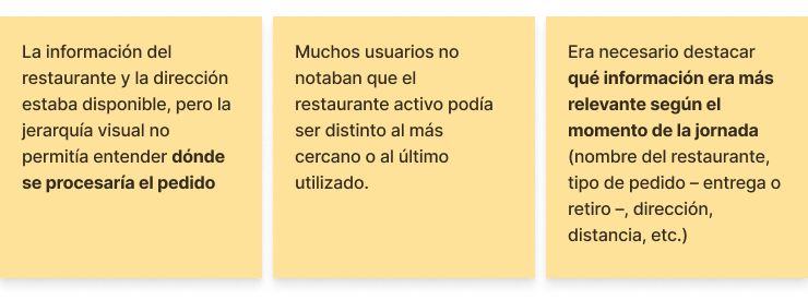 Recibimos una cantidad significativa de quejas relacionadas con pedidos realizados en el restaurante equivocado. La causa principal identificada era la falta de claridad en la presentación de la información de localización en el header de la app.