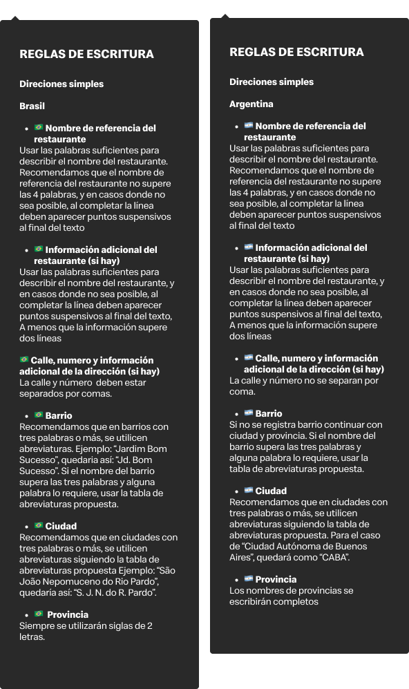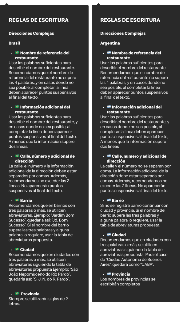 Este análisis nos permitió identificar qué elementos debían priorizarse en el header para que la ubicación fuera comprendida de forma inmediata y precisa por personas usuarias de ambos países. Con base en eso, creamos un manual de recomendaciones, con reglas de escritura para direcciones simples y complejas.