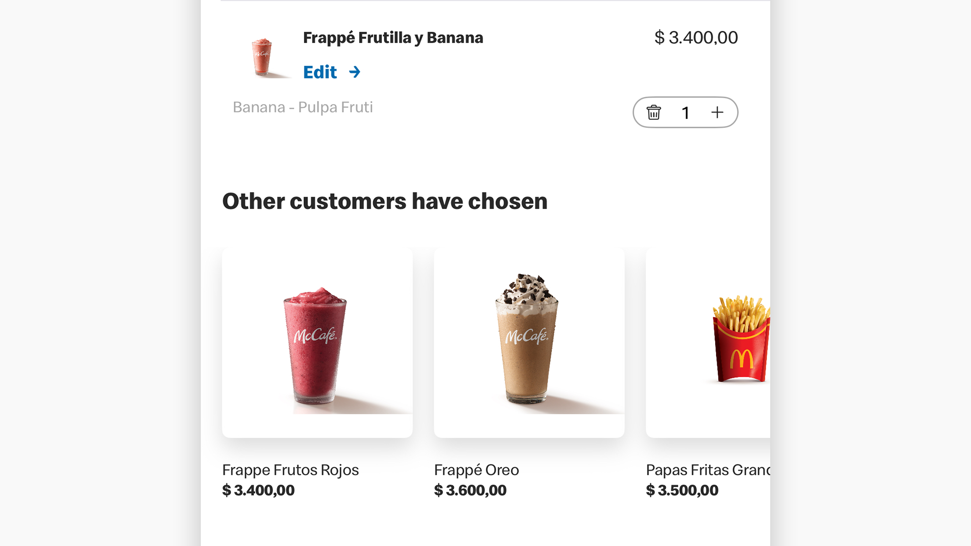 En esta versión, vamos a incluir un testeo para validar la hipótesis de que, cambiando el título "¿Quieres sumar algo más?" por una frase más persuasiva, la atención del usuario se centrará más en el carrusel y aumentará la posibilidad de que agregue más productos al pedido.