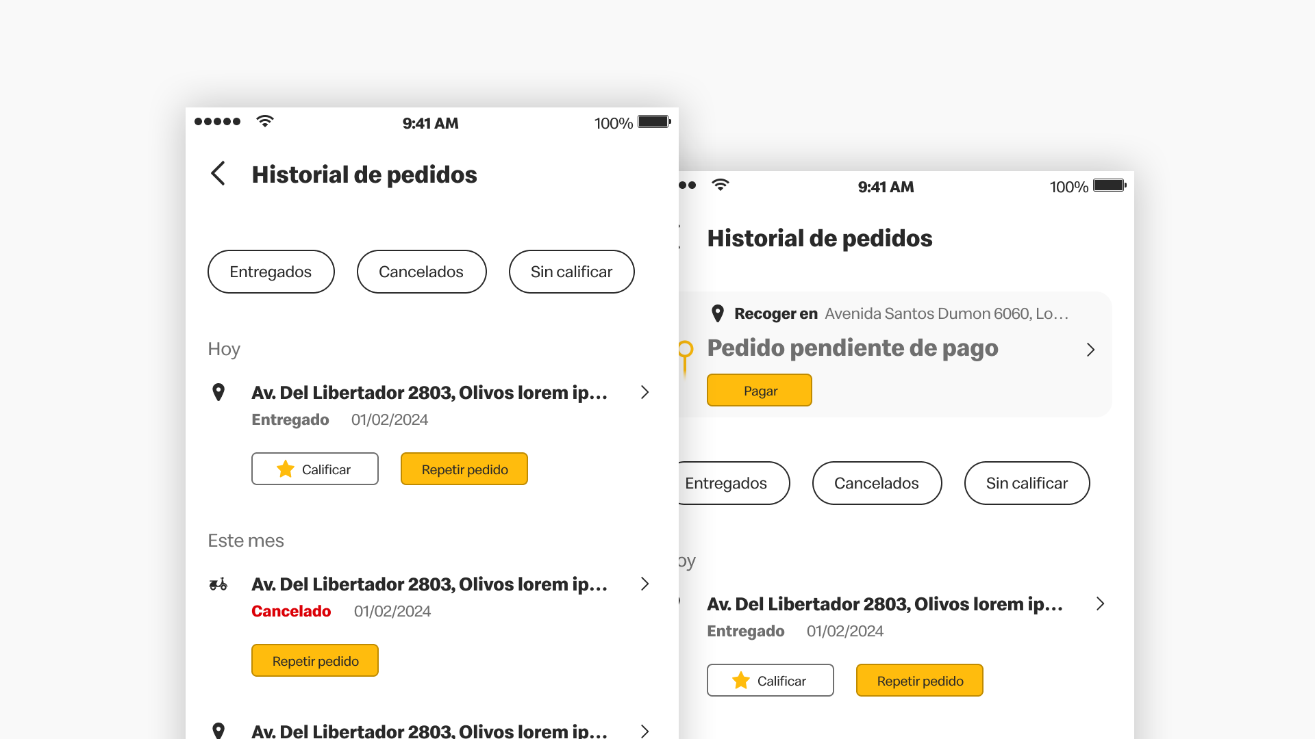 Unificamos los listados de pedidos en curso y finalizados en una única sección de pedidos, ordenados desde la fecha más reciente a la más antigua, con el objetivo de darle mayor claridad al usuario. Asimismo, añadimos filtros para que los usuarios puedan encontrar rápidamente aquellos pedidos que deseen ver (entregados, cancelados y sin calificar), y sumamos el componente smartcard (presente en la Home) para indicar el estado de los pedidos en curso, todo en una misma pantalla. Con estas mejoras, buscamos optimizar la encontrabilidad del detalle de cada pedido, reduciendo los contactos a CX y mejorando el NPS.
