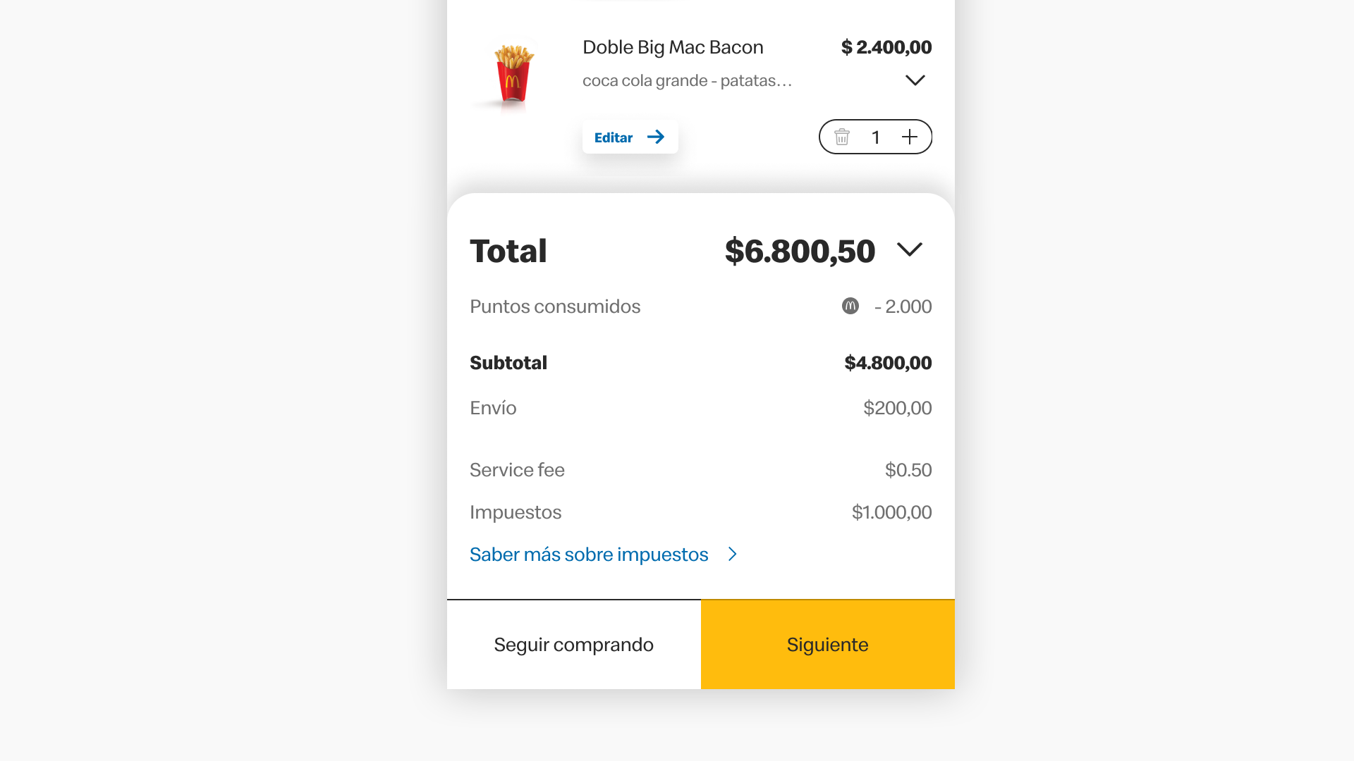 Extras (fees e impuestos): Ejemplos: tasas, Service fee, small order fee, etc. Cada opción contará con un tooltip informativo y, si hay más de un costo extra, se mostrará un hipervínculo que abrirá una pantalla con información detallada.